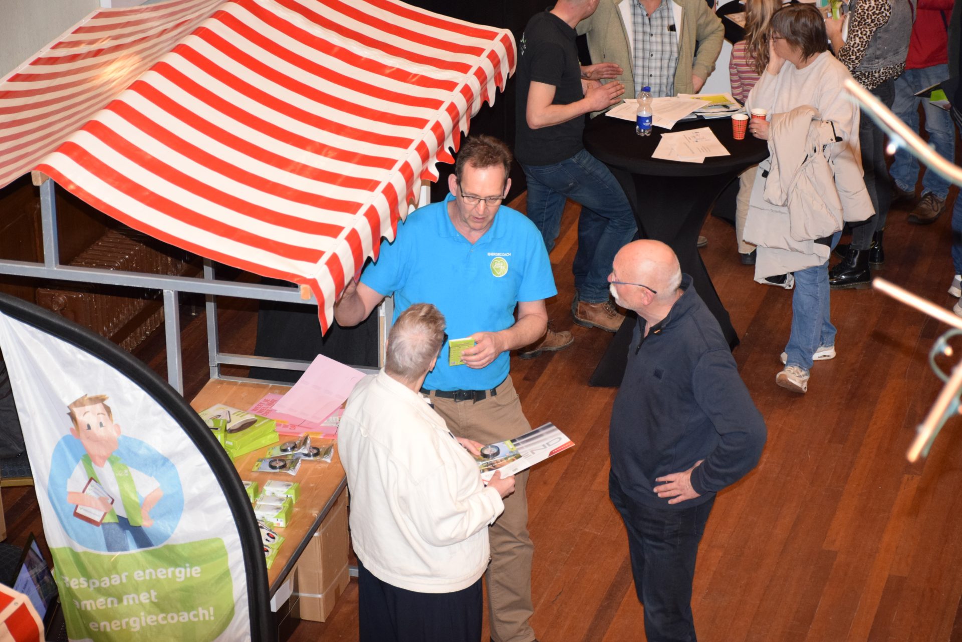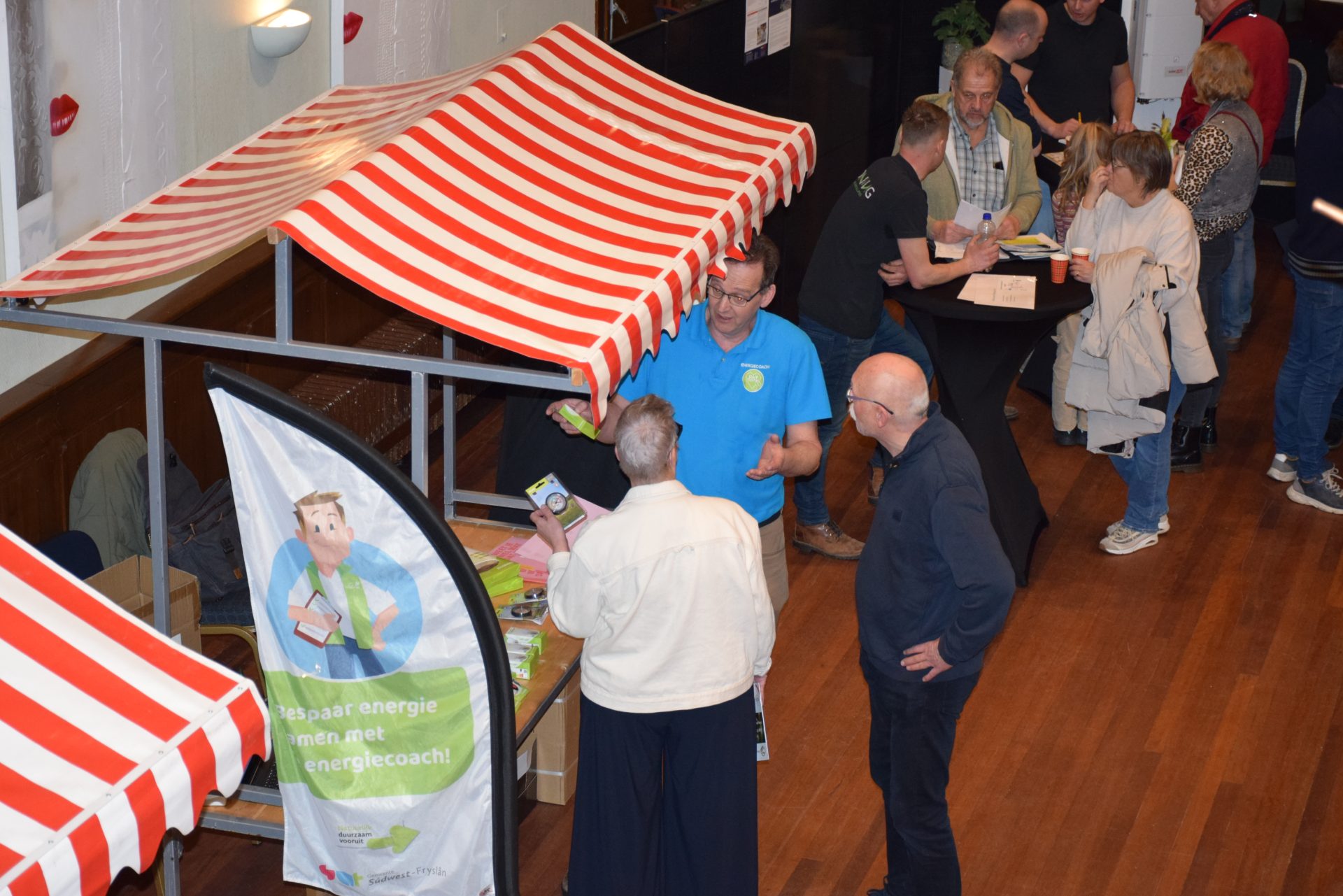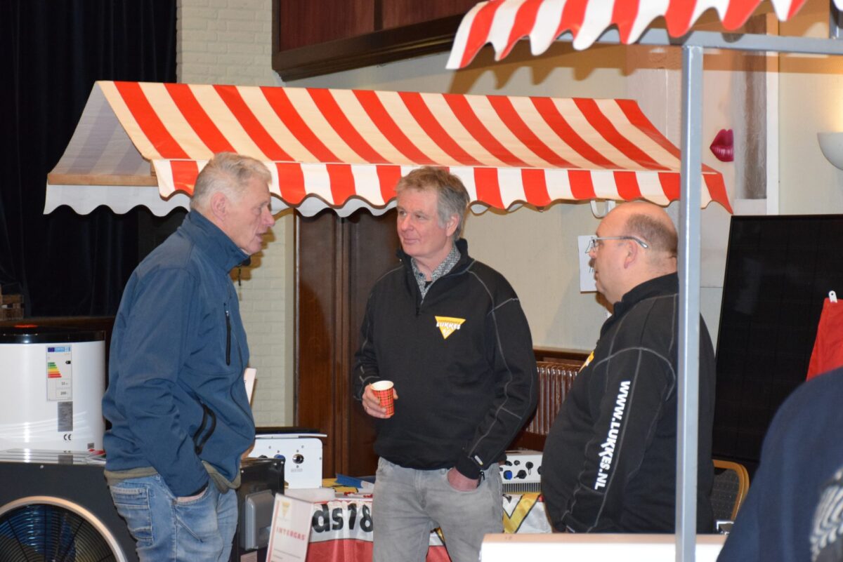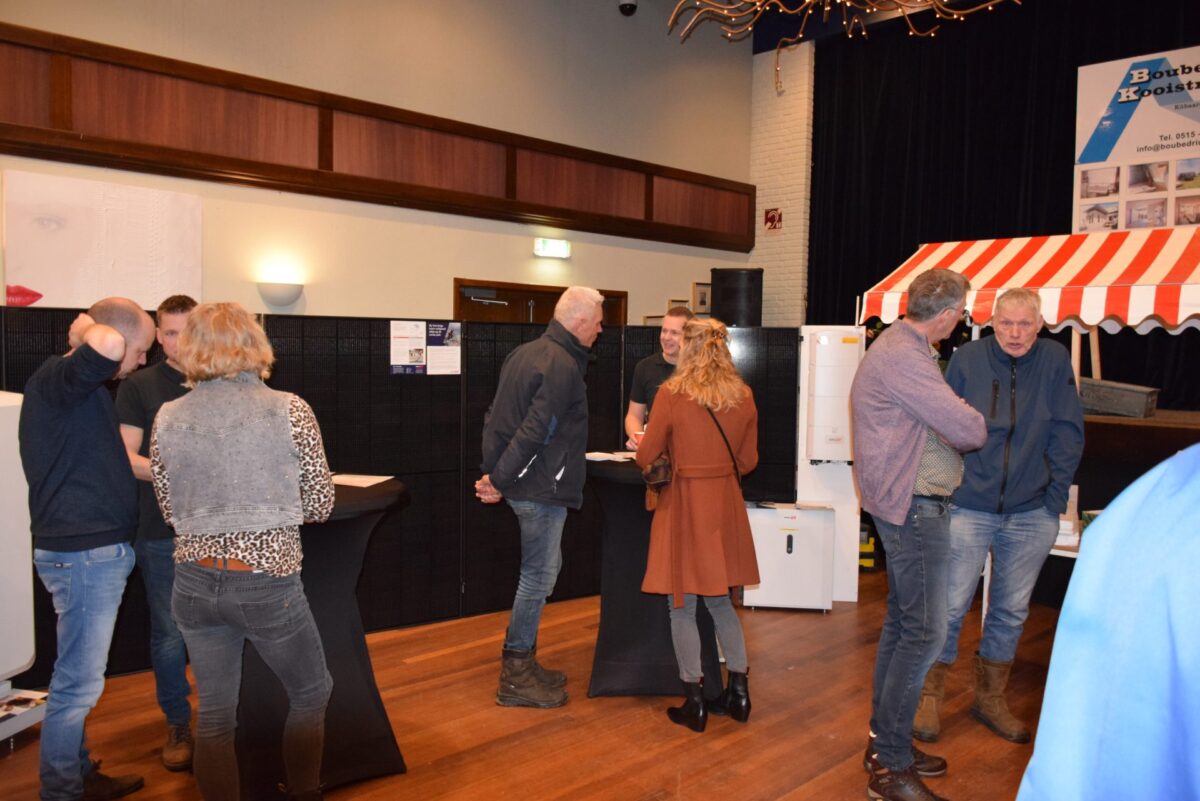 Standhouders waren: de Smit Isolatiegroep met diverse isolatiematerialen, De Wolk Glas met verschillende soorten isolerend glas, de Friese Milieufederatie met info over biobased isolatiemateriaal, Bouwbedrijf Kooistra Kûbaard/Wommels met duurzaam bouwen, Installatiebedrijf Lukkes met warmtepompen, zonnepanelen en thuisbatterijen, Koning Installatie met thuisbatterijen en zonnepanelen, Atsun over slimme energieoplossingen, Confin van Pier Zwerver uit Wommels over energieadvies en energielabels, Henk Zegwaard van Betaalbaar Gasloos over voordelig vervangen van CV door warmtepomp, Zwembad De Klomp over heatpipes waar ze tegenwoordig het zwembadwater mee verwarmen, de Gemeente SWF met energiecoaching en info over subsidies en de WEK met energiecoaching, warmtebeeldcamera en energieadvies.
