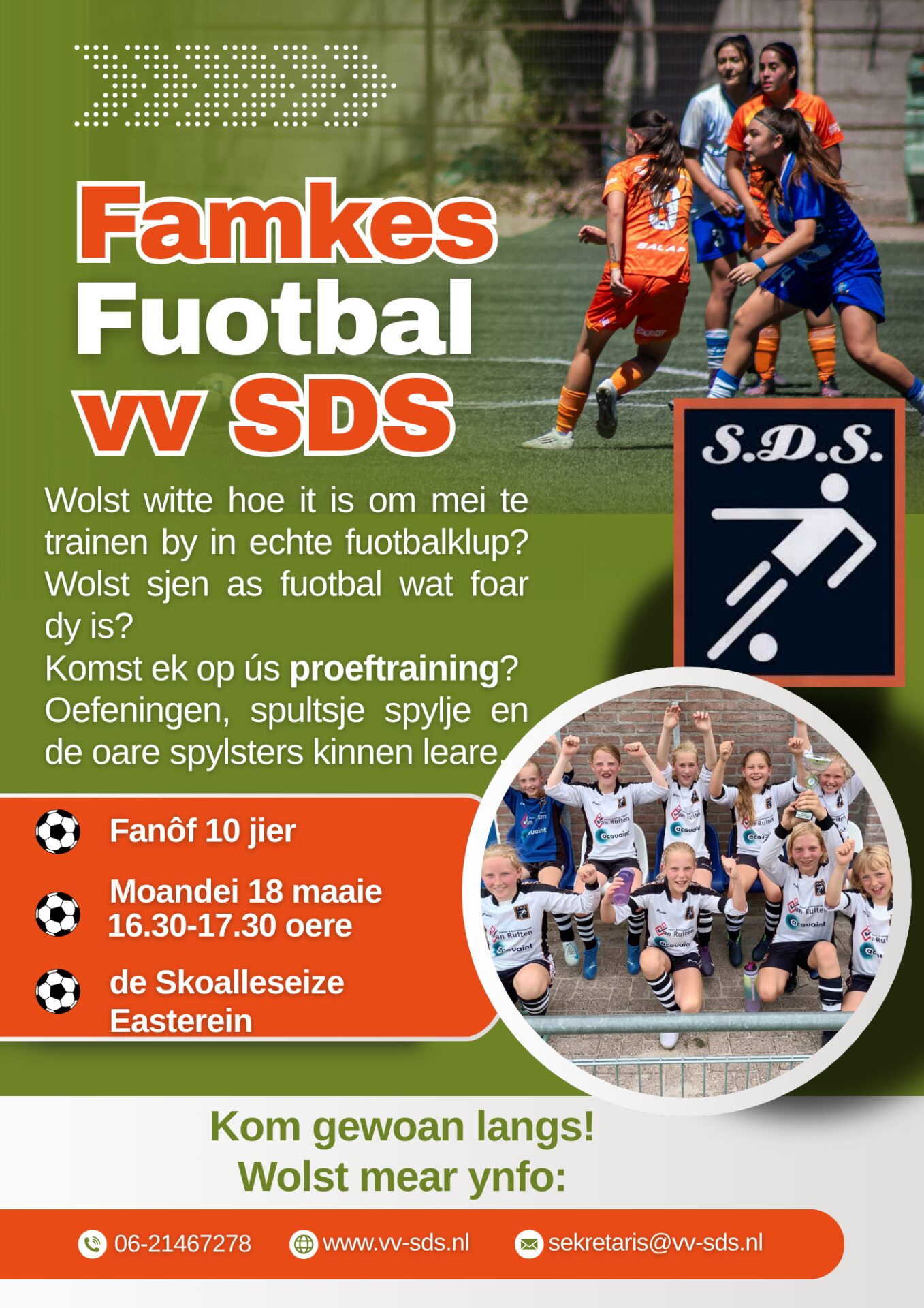 Moandei 18 maaie proeftraining foar famkes by SDS. Liket it dy ek wat? Kom dan del. Foar mear ynfo sjoch de poster.