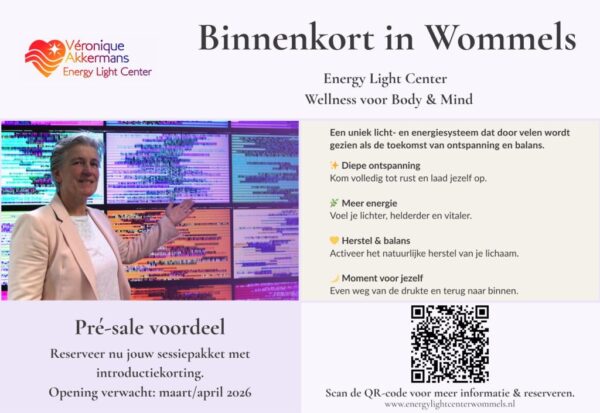 Zo’n ruimte met die optimale frequentie gaan we creëren. De pré-sale is gestart. …gebruik hiermee de win-win situatie… jij enorme korting op de eerste sessies en ik startgeld voor de opening. Dus ga snel naar de website voor meer informatie en voor gebruik van de korting en steun zo dit mooie baanbrekende initiatief wat gezien wordt als de toekomst van ontspanning en activeren zelfhelend vermogen. De hoogste korting is geldig tot 31-12-2025.